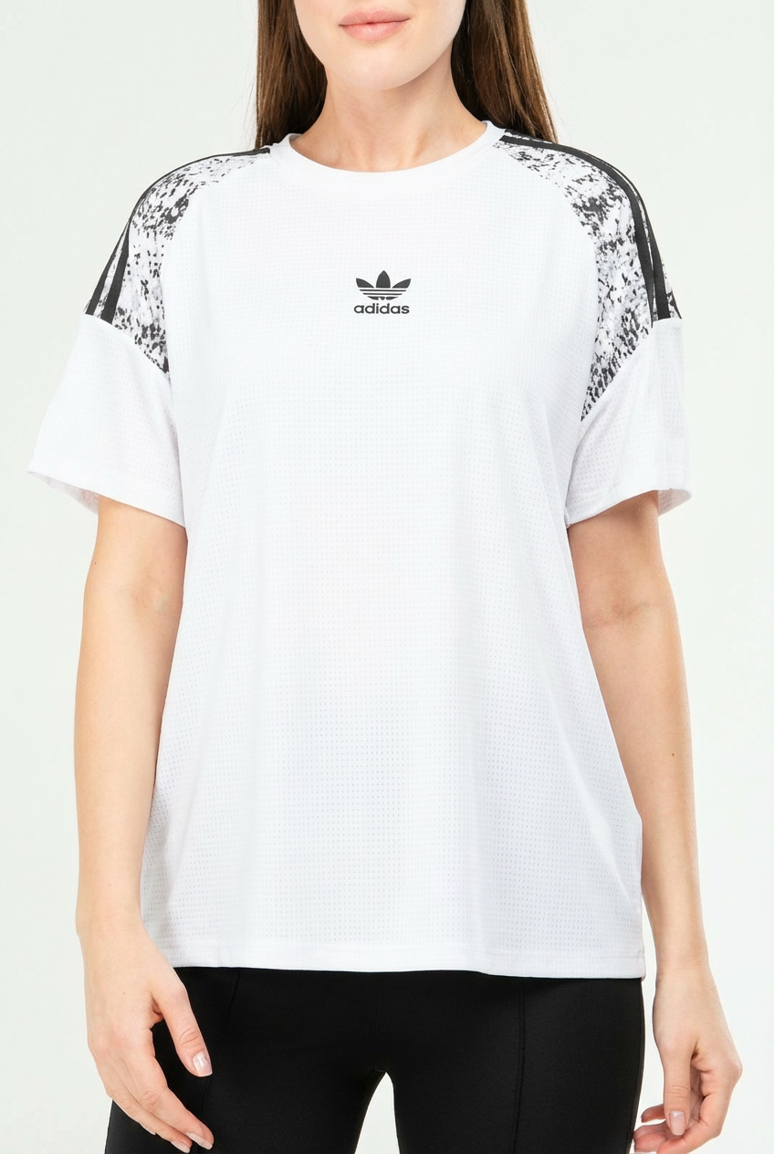 قصّة مريحة تبرز الإطلالة بشكل أنيق بدون مبالغة، مع شعار أديداس الأصلي اللي يضيف لمسة رياضية راقية.